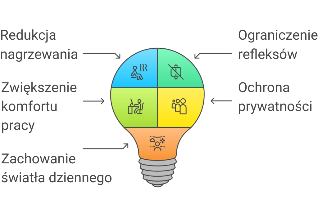 • Zmniejszenie olśnienia – bardziej komfortowa praca przy komputerze i w pomieszczeniach biurowych.