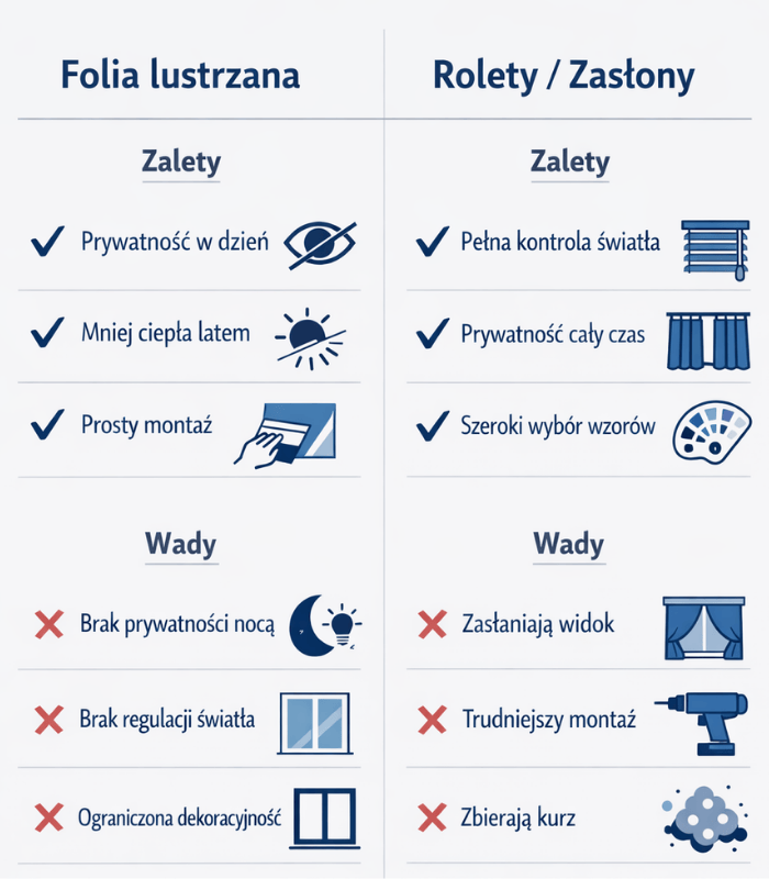 • Wady folii: brak prywatności nocą, brak regulacji światła, ograniczona dekoracyjność.