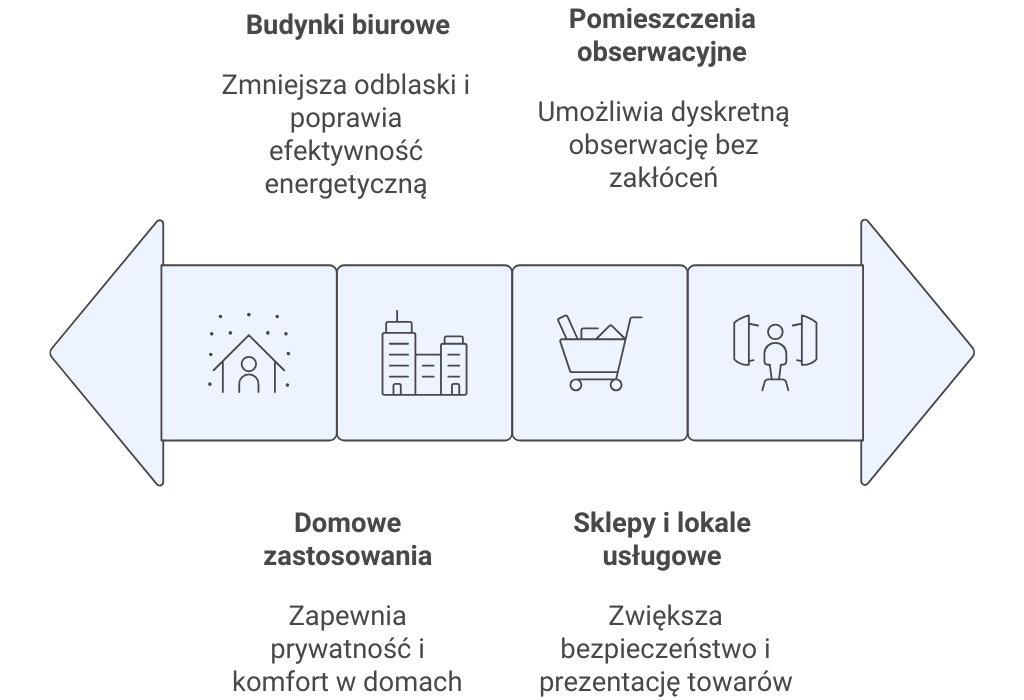 Spotkasz je w biurach, pomieszczeniach obserwacyjnych, domowych salonach i łazienkach, sklepach oraz lokalach usługowych. Sprawdzają się wszędzie tam, gdzie chcesz w dzień zachować prywatność i widzieć, co dzieje się wokół.